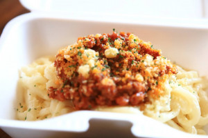 こだわりシェフがじっくりと煮込んで作ったミートソース。 + 特性ソースを絡めたコシのある香川県産の麺 ソースを絡めただけではない旨さが確かにある! 温泉たまごのトッピングで更にまろやかになりますよ。