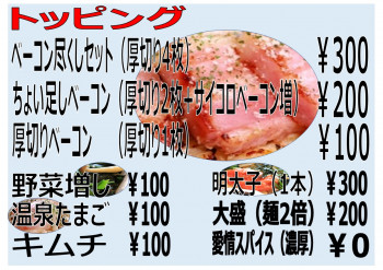 キッチンカー今ちゃんではトッピングがあります。 明太子を足したり、温泉たまごを足したりできます。ベーコン尽くしセットにすると厚切りが4枚も!? こっそりと書かれている愛情スパイス♪心を込めて調理しております。 粉チーズは無料でおかけしておりますので沢山欲しい方は注文の時に言ってください。 お好みのカルボナーラ風うどんでお楽しみください。
