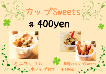 ホイップクリームの上に小さなワッフルや一口サイズの焼き芋がゴロゴロ♪片手に持ってパクパク食べれるスイーツ。