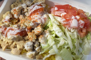 ターメリックライス、レタス、トマトで見た目も色鮮やか。 ヨーグルトとスパイスに漬け込んだチキンのNY定番屋台メシ。