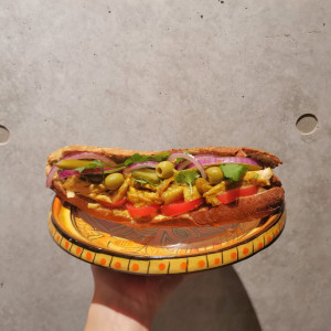 モロッカンサンドイッチは、全粒粉フランスバゲットをベースに、自家製レモンチキン、今日のグリーン、フレッシュトマト、レッドオニオン、ピクルスとオリーブ、自家製マヨネーズと秘伝のオリジナルソースでお届けします。