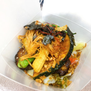 つくねフリット、ナムル、マリネ、せせり煮を基本トッピング。 これに 季節の野菜を素揚げしてのせています。