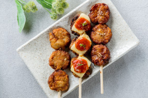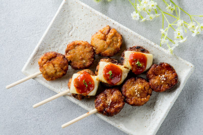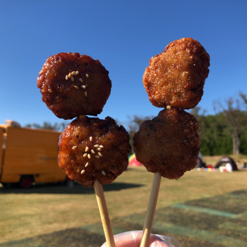 一番人気は カリッ、ジュワ〜!、ふわふわの 『つくねフリット』300円〜 味はしお、タレ、カレー、ピリ辛チーズの 4種類をご用意しています。 おやつ、おつまみに ペロリとお召し上がり頂けます。
