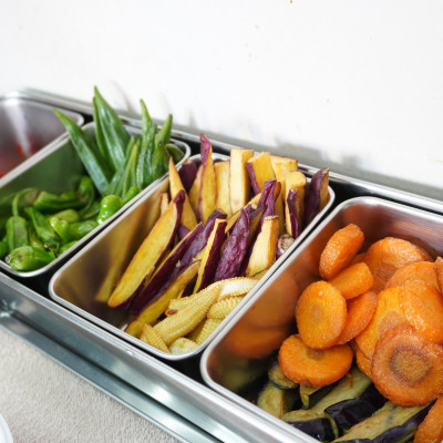 お弁当商品として 唐揚げ弁当、つくねライス、 季節のカレーなどをご用意しています。 野菜は季節に応じて、その時の旬なものを 選んで仕入れしています。 季節によって変わる 野菜のラインナップをお楽しみください。