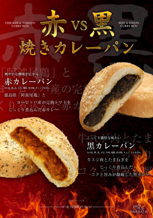 徳島県産阿波尾鶏とヨーロッパ産の完熟トマトを使用したスパイシーな赤! 牛スジとタマネギをじっくり煮込みコクとうまみを凝縮させてピリッとした黒! 揚げずに焼くことでヘルシーに仕上げたカレーパンをどうぞ!