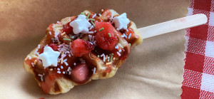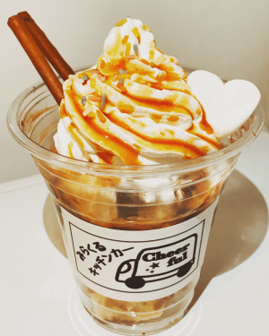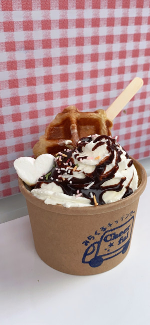 クロッフルバーにたっぷりのホイップとお好みのソースをかけてどうぞ! ちょこんと乗ったハートのマシュマロもカワイイ!