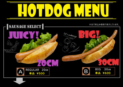 nana-no-moeのホットドッグは、もちもちのソフトフランスパンに20㎝と30㎝の選べるソーセージでボリューミーでおいしいホットドッグをご用意しております。