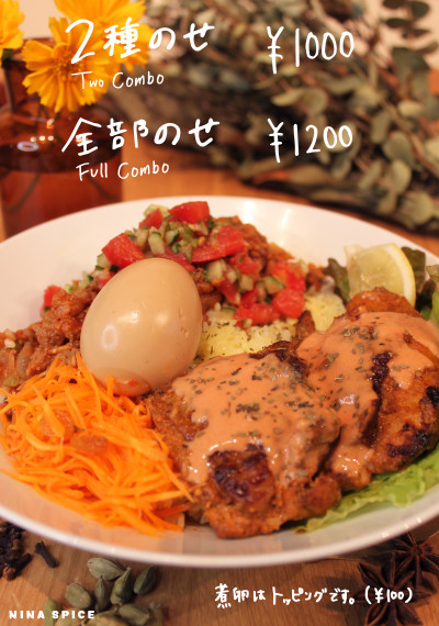 「2種のせ弁当」 NINA SPICEの一押しメニュー! タンドリーチキン・ジンジャーポーク・チリコンカンからお好きなおかず2種類お選び頂けます。 どの組み合わせも大満足のボリューム!味!コンビネーション!になっております。 是非一度お試しあれっ❤︎