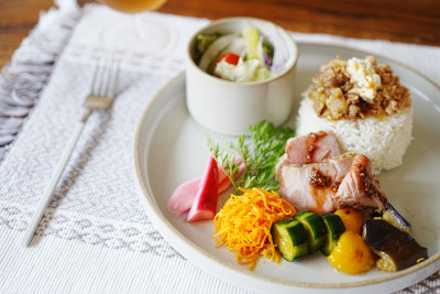 しっとりしたローストポーク、懐かしい味わいの鶏そぼろなどと、旬の野菜の副菜を数種類詰め合わせたランチBOXです。季節により内容の変化も楽しめます。