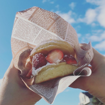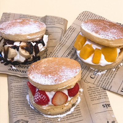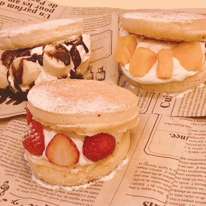 みんな大好きなパンケーキに生クリームとフルーツをはさみました。 フルーツは季節にかよってかわりますがオールシーズン楽しんでいただけます!
