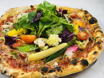 OrigineOrtoの看板メニュー! 『10種類以上の無農薬野菜を使用したオルトラーナ』は無農薬野菜を贅沢にのせています!そしてお野菜の素材の味を楽しんで頂くために、あえて火を通さず生のままのせたサラダピッツァです!自家製の無添加ドレッシングと一緒にお召し上がり下さい!