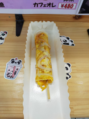 オリジナルの中華ドック! フランクフルトに卵を巻いて中にケチャップなどを入れた商品!