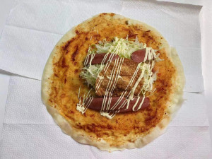 煎餅菓子は、20種類以上の香辛料を使ったタレが自慢!自家製ラー油でピリッと辛く!中華ドックは、当店オリジナル!生地は卵!