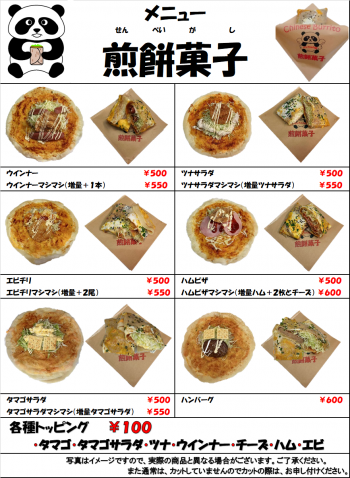 | 提供メニュー: | 煎餅菓子(ブリトー)串串焼(カステラ)中華ドック(アメリカンドッグ)果実ティー タピオカ バナナジュース |