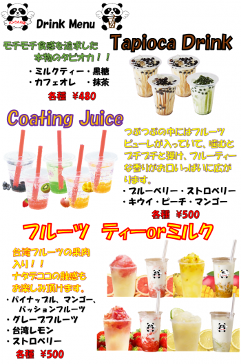 タピオカ!モチモチしています。4種類! 果実ティー!台湾の果実をふんだんに使い、ナタデココで食感も楽しめます。4種類 コーティングジュース!韓国で大人気となったプチプチ感がたまらない!