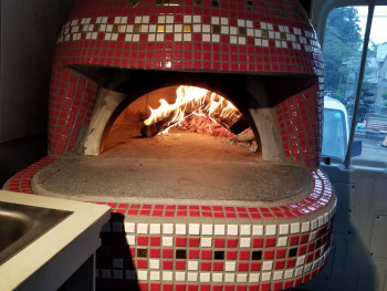 車内にオーダーメイドのピッツァ窯を搭載しました。コンパクトサイズですが、性能も良く、炉床の遠赤外線でピッツァを1分で焼き上げます。