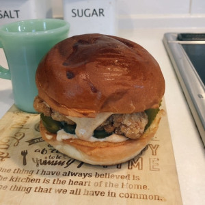 鶏むね肉とピクルスをオリジナルソースで味付けしブリオッシュバンズで挟みPOPEYESのようなチキンサンドに仕上げました。