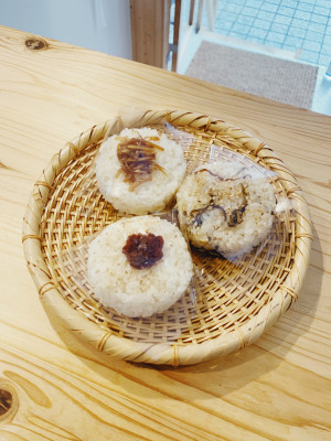 おにぎりを3種類ご用意しています。小腹がすいたらおにぎり1つ。ランチにおにぎり3つのセット。お子さんともシェアしやすいおにぎり。みんなの“ちょうどいい”を販売しています。