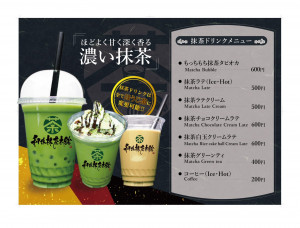 | 提供メニュー: | 抹茶ラテ ほうじ茶ラテ 抹茶ラテクリーム ほうじ茶ラテクリーム 抹茶チョコクリームラテ 抹茶白玉クリームラテ 抹茶グリーンティ 抹茶タピオカ コーヒー 抹茶フォンヂュ団子 抹茶わらび餅 抹茶生チョコアイス 抹茶ソフトクリーム 抹茶フォンダンショコラ |