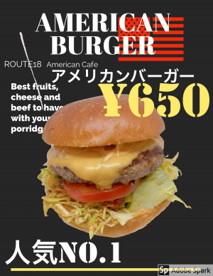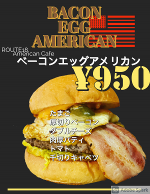 アメリカンバーガーにベーコン、タマゴ、2種類のチーズをトッピングした食べ応え抜群のバーガー。
