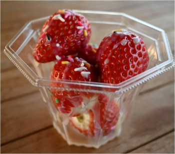 完熟のいちごを収穫し、へたをとって、急速冷凍庫で-40℃の急速冷凍。その後真空包装して鮮度を保持したこだわりの冷凍いちごを専用の機械で薄く削って練乳をかけました。