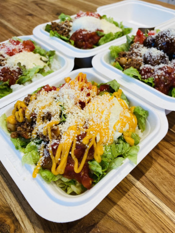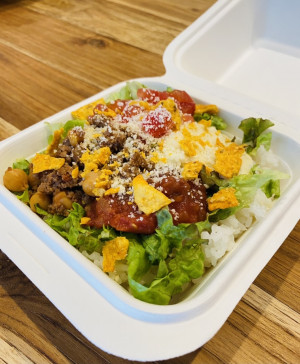具材は レタス、タコミート、フレッシュカットトマト、サルサソース、タルタルソース、トルティーヤチップス、パルメザンチーズを炊き上げた棚田米秋田こまちの上にドサッと盛ったヘルシーでとても満足のいくタコライスです!