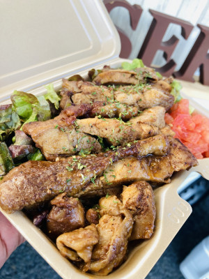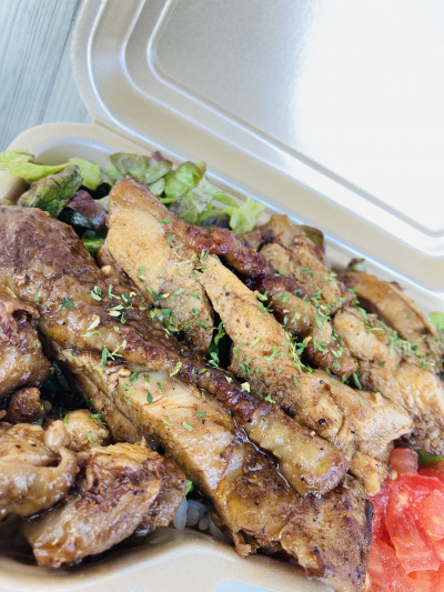 ご飯の上にサニーレタスを敷いてその上にジャークチキンを乗せた ガッツリランチ系弁当です!ガテン系、オフィスサラリーマンの方々に大人気!! 付け合せにはお口直しのフレッシュトマト! ジャークチキンは本場の味より食べやすい味付けにしております。