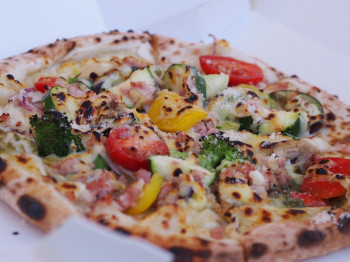 ペレット燃料を使い高温で焼き上げる ピッツァは表面カリッと中はモチモチ 食感 オリジナル手作りソースも自慢です。 野菜たっぷりの菜園風 ピッツァ・オルトナーラは人気No.1