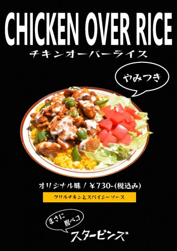 スタービンズのチキンオーバーライスは 本場ニューヨークの味を完全再現!! スパイシーチキンにごはんがすすみます レッドソース、ホワイトソースをサラダと混ぜてお召し上がりください。 アメリカンなひとときをお楽しみください