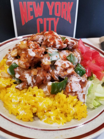 当店初めての方はチキンオーバーライスオリジナルをおすすめしております。 辛さはソースで調整できます。