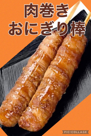 モチモチのごはんにお肉がぐるぐる巻いてある『肉巻きおにぎり棒』オリジナルタレがかかってます。歩きながらもサクッと食べられるワンハンドフード。