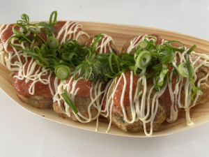 ふわとろで熱々なたこ焼きにポン酢とマヨネーズとねぎをトッピングさっぱり食べたい時におすすめです