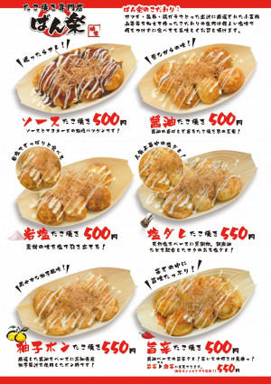大きなタコが入った関西風のフワトロたこ焼きです。 定番ソースから旨辛ダレなどお子様から大人の方まで楽しんでいただけるよう様々なソースをご用意しました。 ぜひ一度ご賞味ください。