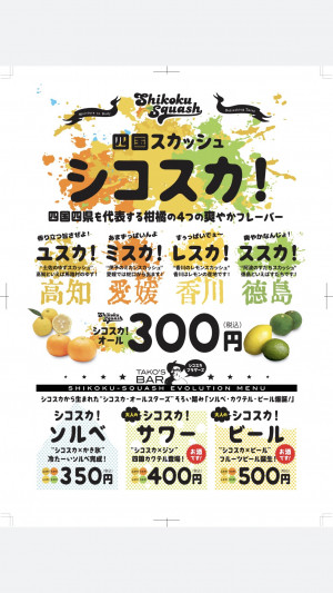 | 提供メニュー: | たこ焼き各種 オリジナルドリンク「シコスカ(四国スカッシュ)」 |