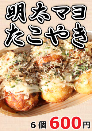 子供から大人まで幅広く人気な明太マヨたこやき。 明太好きにはたまらない一品! ソースたこやきと食べ比べもあり!
