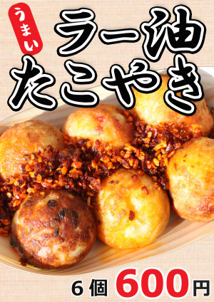 リピーター続出のラー油たこやき。 特製ラー油がピリッと辛く癖になること間違いなし! お好みで辛さ調整可能です。