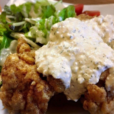 当店では宮崎県発祥そのままのチキン南蛮をご提供、知って頂く活動を行っております。 ふんわり揚げた鶏肉に甘酢をくぐらせタルタルソースをのせたチキン南蛮はご飯のおかずにもお酒のおつまみにも冷めてもおいしい一品です。