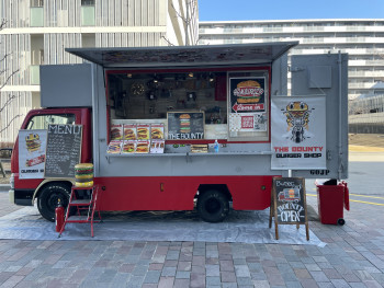 THE BOUNTY のキッチンカーは赤とグレーのお洒落かつ可愛いキッチンカーの作りになっております。 1から作り上げたトラックで塗装や内装までも全て自ら手がけました
