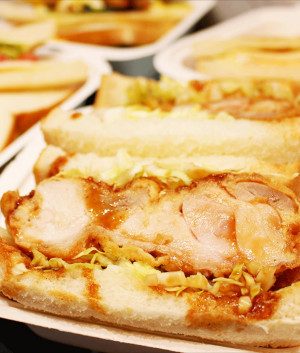 ソースが効いたチキンカツとシャキシャキキャベツのボリュームたっぷりのサンドウィッチ! お腹いっぱいになること間違いなし!