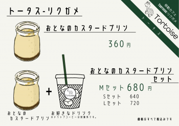 Tortoise-リクガメのオススメメニューはカスタードプリンです。カスタードプリンは毎回開始1時間ほどで完売してしまうほどの人気です。