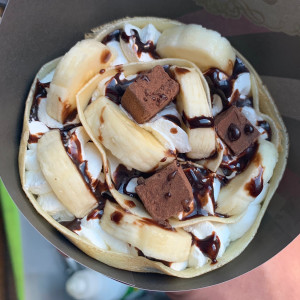 当店人気NO.1!甘すぎないホイップクリームに深い味わいのチョコソースとバナナの絶妙のバランス。手作りのビター生チョコがトッピングされた逸品。