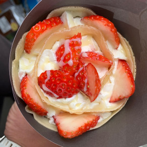 いちごと言えば練乳!甘すぎない乳脂肪入りのホイップクリームが全体をまろやかに仕上げます。イチゴクレープは12月〜5月までの限定商品になります。