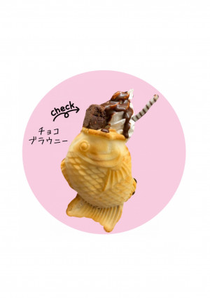 たいやきにパフェが入った進化系スイーツたいやきパフェ! バニラアイスとホイップクリームに濃厚チョコブラウニーをトッピング。 お腹の中の餡は、おぐらかクリームを選べます。
