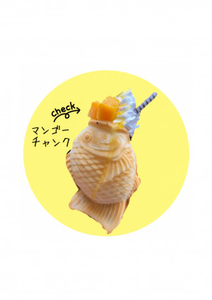 たいやきにパフェが入った進化系スイーツたいやきパフェ! バニラアイスとホイップクリームにひんやりマンゴーチャンクをトッピング。 お腹の中の餡は、おぐらかクリームを選べます。