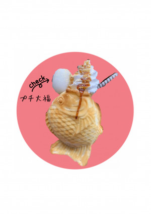 たいやきにパフェが入った進化系スイーツ、たいやきパフェ! バニラアイスとホイップクリームにプチ大福のトッピング。 お腹の中の餡は、おぐらかクリームを選べます。