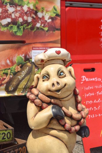 「田原ポーク」の養豚農家のキッチンカー。メニューはもちろん、「田原ポーク」をすべて使っております。ブタコレクションのアンティーク雑貨などもお楽しみください!ブタのイベントはぜひお声掛けを。