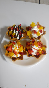 ワッフルボール。 季節によりトッピングフルーツが違います。 ソースはストロベリー、キャラメル、チョコの3種類から選べます。