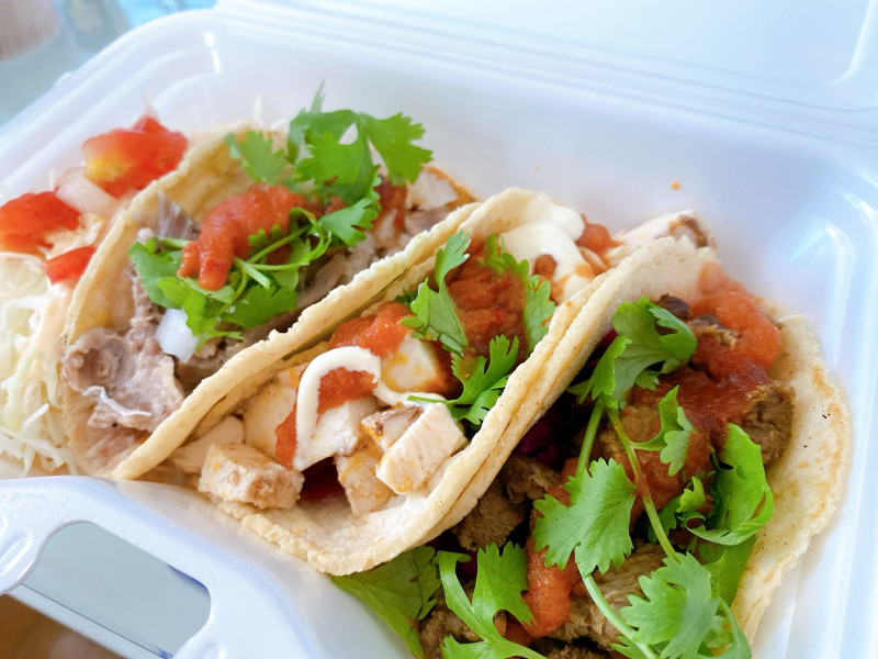 タコス5種(ジャークチキン、牛タン、カルニタス、カレーハラミ、スパイシーミンチ) フルーツドリンク