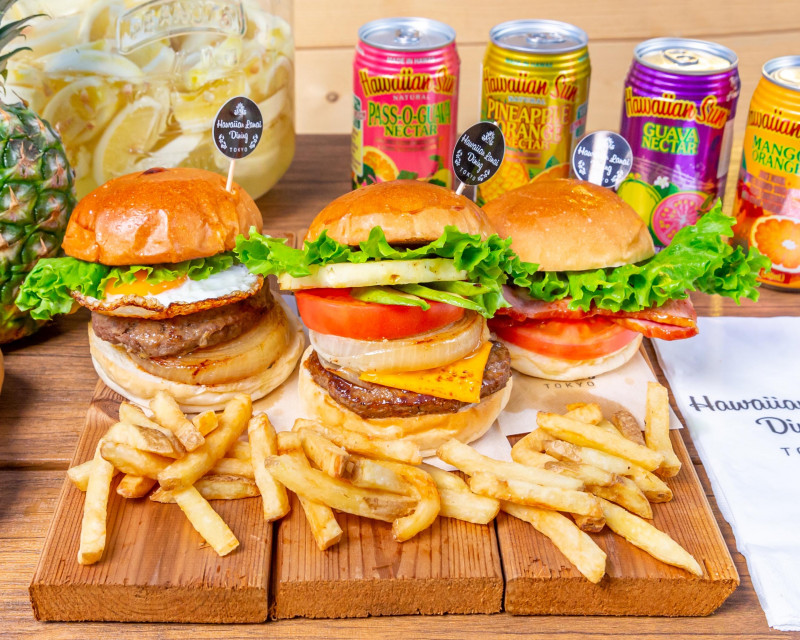 ハワイ料理 自家製無添加バンズを使用したハンバーガー ガーリックシュリンプ 自家製無添加フライドポテト モチコチキン(ハワイの唐揚げ) ロコモコ KONAビール(ハワイ定番ビール)、ハワイアンサン(ハワイ定番のネクタージュース)、ハワイアンレモネード、等